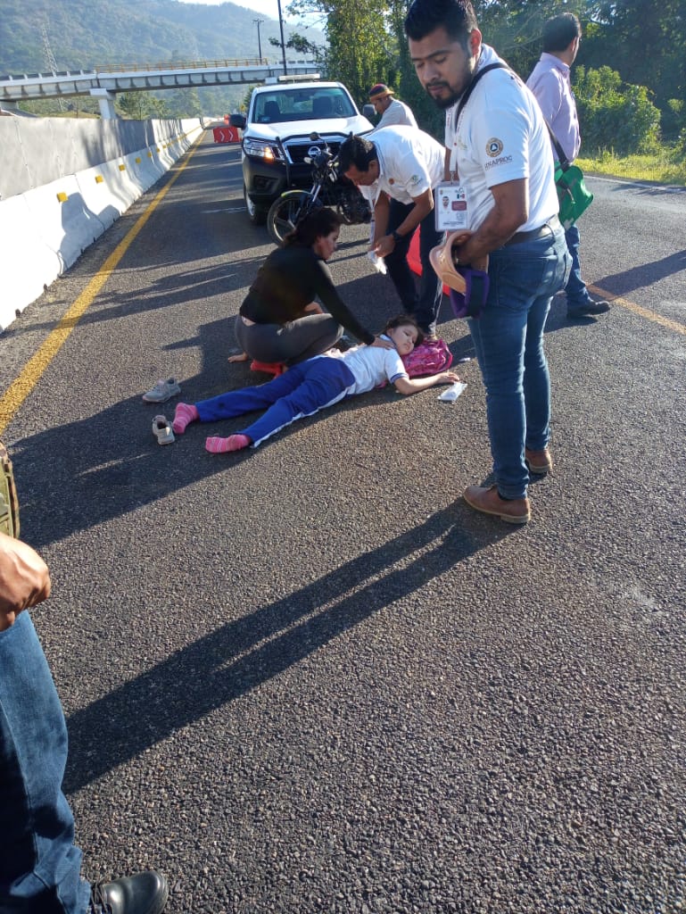 Lo anterior fue dado a conocer por tránsito del estado, y la policía municipal de Huixtla, indicando que al lugar arribó protección civil para atender a una menor que se encontraba tirada en posición de cubito ventral sobre la carpeta asfáltica, dijo llamarse Britany July de 9 años de edad, presentaba una lesión abierta de tibia y peroné y golpes contusos en la cabeza y otras partes del cuerpo.