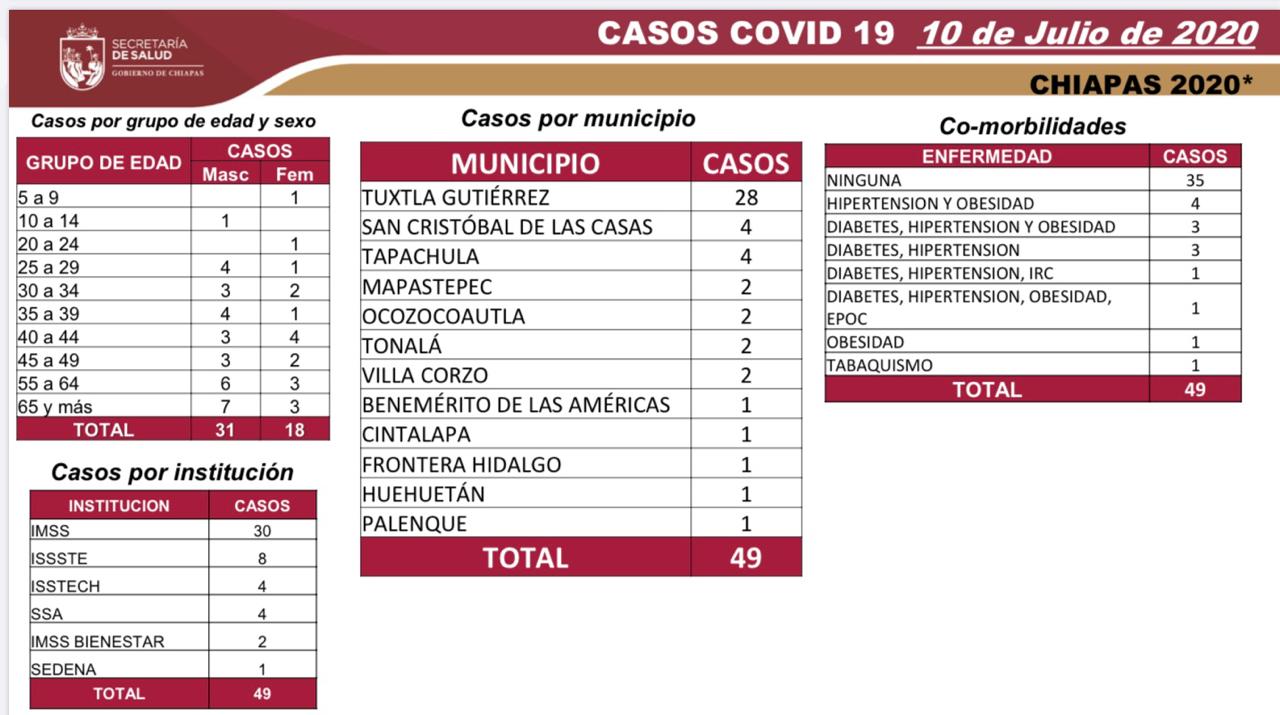 Los casos recientes se registraron en los siguientes municipios: Tuxtla Gutiérrez, 28; San Cristóbal de Las Casas y Tapachula, cuatro cada uno; Mapastepec, Ocozocoautla, Tonalá y Villa Corzo, dos cada uno; y Benemérito de las Américas, Cintalapa, Frontera Hidalgo, Huehuetán y Palenque, un caso cada uno.