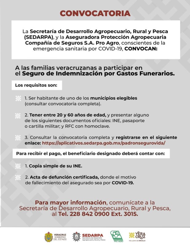 El formulario de registro ya se encuentra en https://aplicativos.sedarpa.gob.mx/padronsegurovida y la convocatoria en la página http://www.veracruz.gob.mx/agropecuario/2020/08/24/seguro-de-indemnizacion-de-gastos-funerarios/.