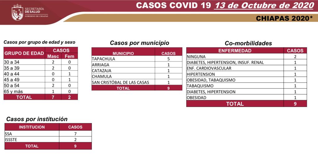 Los casos nuevos se presentaron en los siguientes municipios: Tapachula, cinco; y Arriaga, Catazajá, San Cristóbal de Las Casas y Chamula, un caso cada uno.