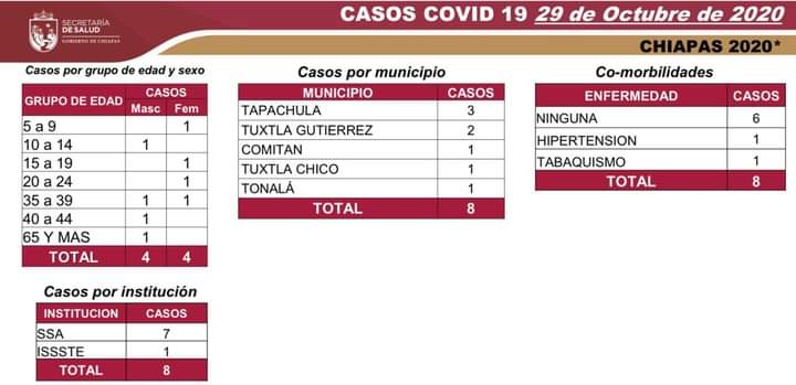Los casos nuevos se registraron en los siguientes municipios: Tapachula, tres; Tuxtla Gutiérrez, dos; y Comitán, Tonalá y Tuxtla Chico, un caso cada uno.