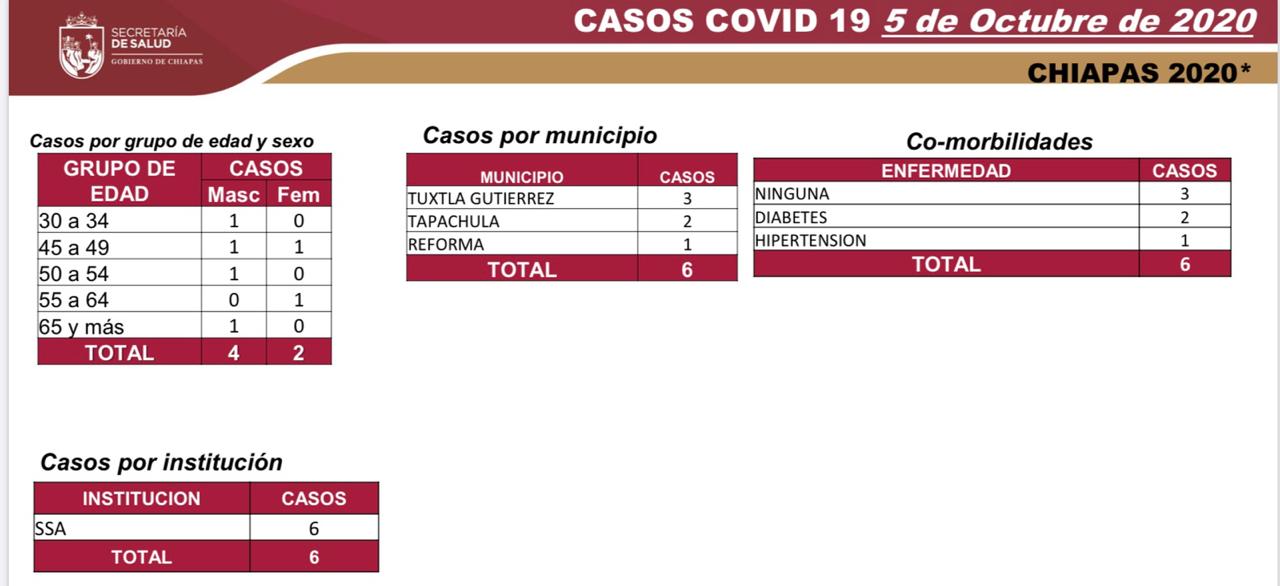 Los casos nuevos se registraron en los siguientes municipios: Tuxtla Gutiérrez, tres; Tapachula, dos; y Reforma, uno. Se trata de cuatro hombres y dos mujeres, de los cuales tres tienen datos de co-morbilidad; dos de ellos presentan diabetes y uno cursa con hipertensión.