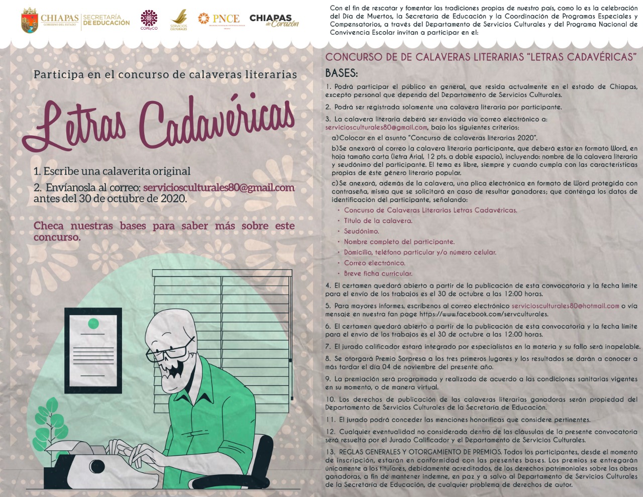Para mayores informes sobre ambas convocatorias, consultar la página de la Secretaría de Educación: http://www.educacionchiapas.gob.mx/convocatorias.html; enviar un correo electrónico serviciosculturales80@hotmail.com o vía mensaje en la fan page https://www.facebook.com/servculturales.