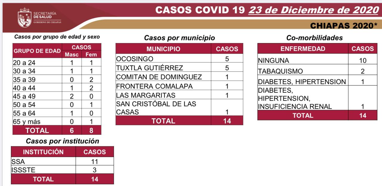 La Secretaría de Salud de Chiapas comunica que en las últimas horas se confirmaron 14 casos positivos de COVID-19 en seis municipioENERs de la entidad, sin reportarse defunciones.