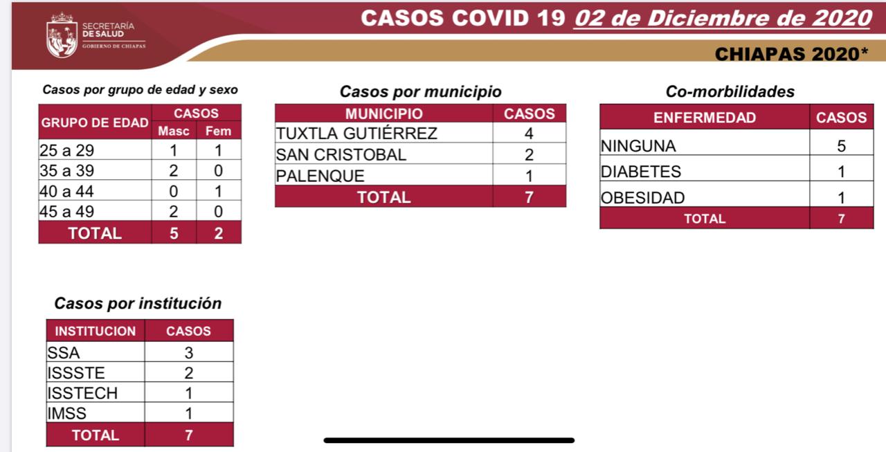 Los casos nuevos se presentaron en los siguientes municipios: Tuxtla Gutiérrez, cuatro; San Cristóbal de Las Casas, dos; y Palenque, un caso.