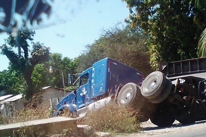 Por falta de precaución, un tráiler cargado de fertilizante se accidento al bajar una pendiente en la zona cañera del municipio de Huixtla.
