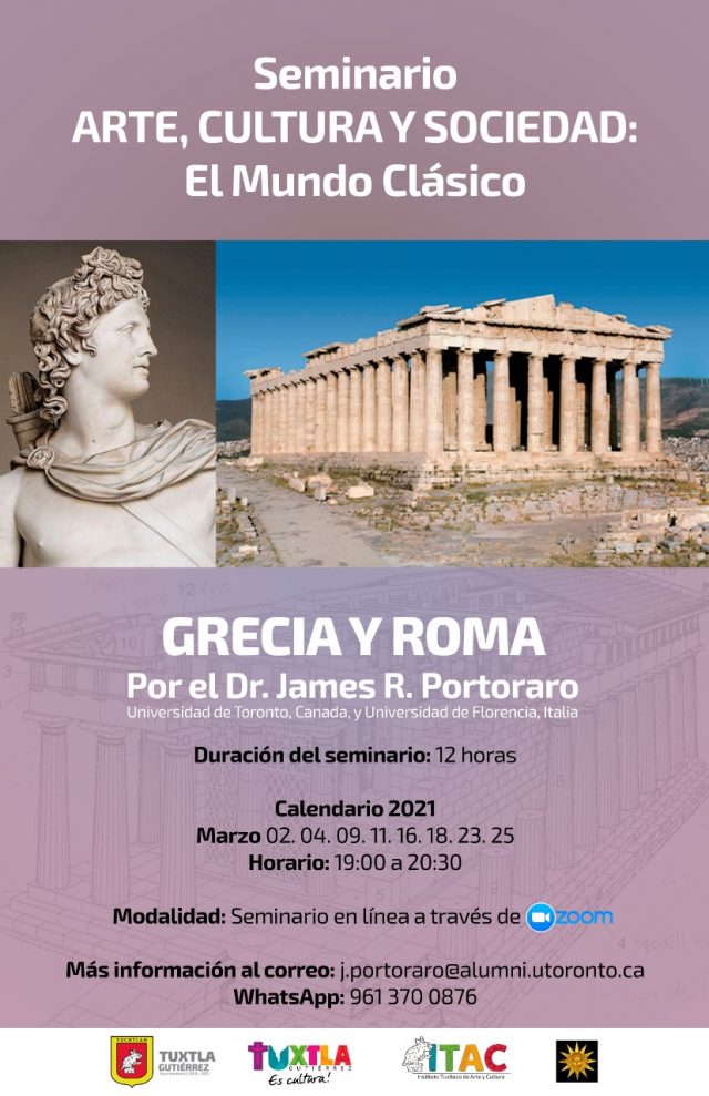 Con el objetivo de difundir y promover el conocimiento de dos culturas decisivas de la historia occidental, cuyas ideas, símbolos y aportes tienen presencia en toda América Latina, el Instituto Tuxtleco de Arte y Cultura llevará a cabo el Seminario “Arte, Cultura y Sociedad: El mundo clásico”, impartido por el Dr. James Portoraro, a realizarse de manera virtual, mediante la plataforma Zoom, del 2 al 25 de marzo del 2021.