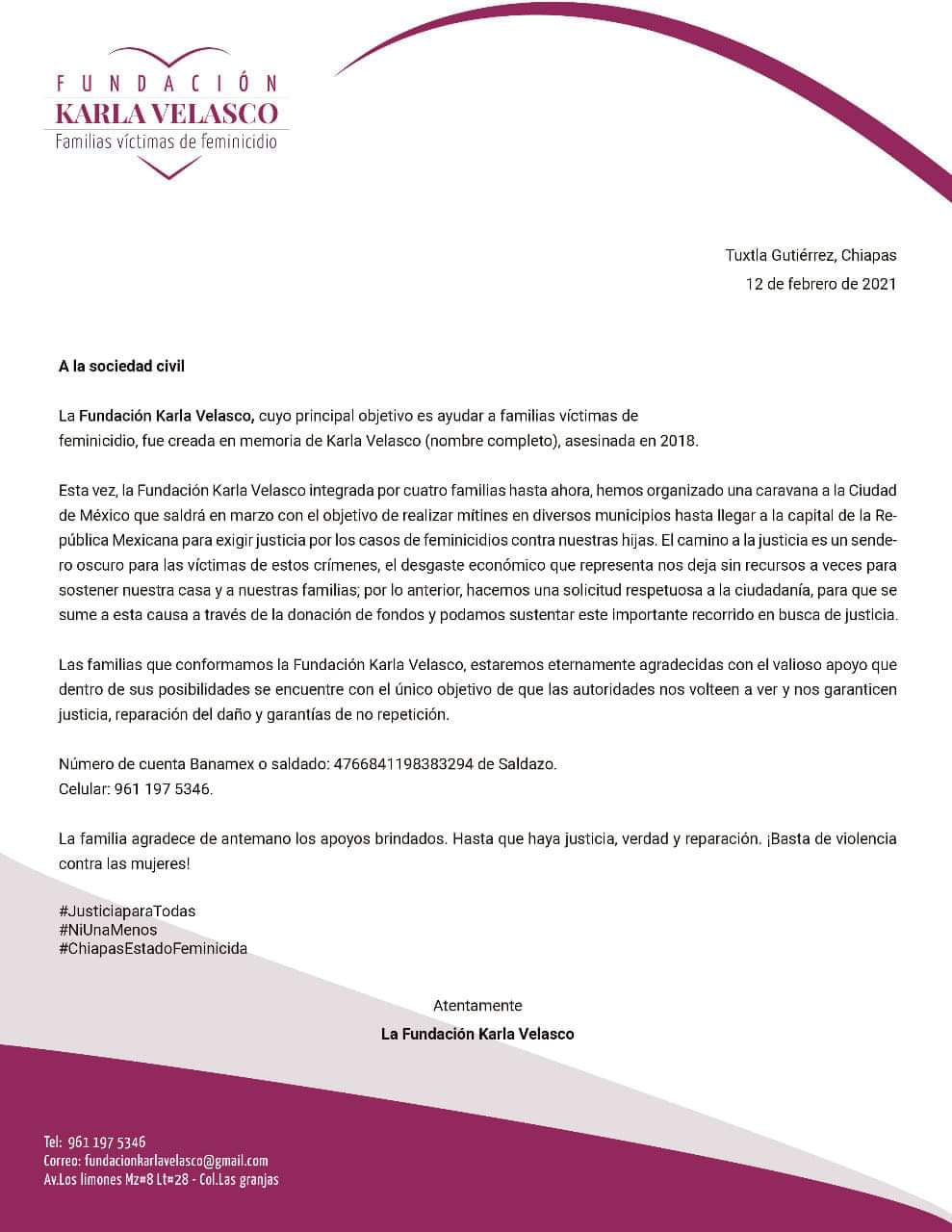 Maricruz Velasco, madre de Karla Velasco, quien fue asesinada el 4 de julio del 2018 en la ciudad de Tuxtla Gutiérrez, detalló que dicha caravana busca apoyar a más familias que han sido víctimas de feminicidio; esta caravana pasará por Oaxaca y Puebla hasta llegar a la Ciudad de México el día 8 de marzo, para buscar una audiencia con el presidente de la República, Andrés Manuel López Obrador.