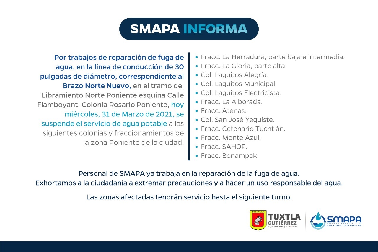 Dicha suspensión se debe a una fuga de agua en la línea de conducción de 30 pulgadas de diámetro correspondiente al Brazo Norte Nuevo, en el tramo ubicado en el Libramiento Norte Poniente esquina Flamboyán de la Colonia Rosario Poniente.