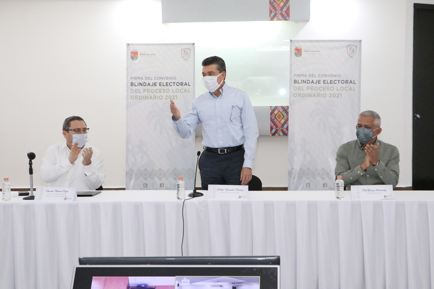 Autoridades del Gobierno de Chiapas, de la Fiscalía General del Estado (FGE) y del Instituto de Elecciones y Participación Ciudadana (IEPC) firmaron el Convenio de “Blindaje Electoral”, con el objetivo de lograr resultados favorables en materia de prevención, investigación y aplicación de sanciones a conductas delictivas, por indebida aplicación de recursos públicos y los programas de carácter social en el proceso local ordinario 2021.