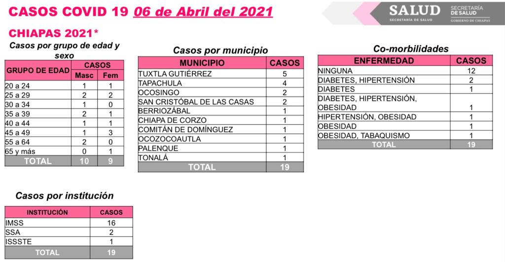 La Secretaría de Salud de Chiapas informó que los contagios recientes se distribuyen en los municipios siguientes: Tuxtla Gutiérrez, cinco; Tapachula, cuatro; Ocosingo y San Cristóbal de Las Casas, dos cada uno; y Berriozábal, Chiapa de Corzo, Comitán, Ocozocoautla, Palenque y Tonalá, un caso cada municipio.