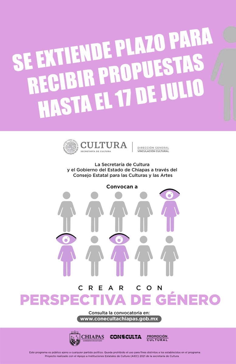 El Consejo Estatal para las Culturas y las Artes de Chiapas (Coneculta), a través de la dirección de Promoción Cultural, amplía las fechas de recepción de proyectos de la convocatoria Crear con Perspectiva de Género.