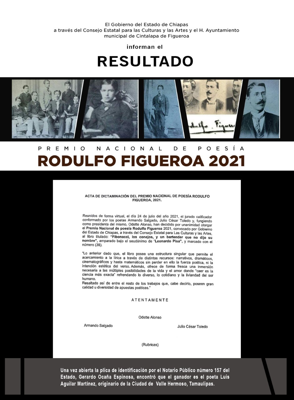 Por otro lado, Luis Aguilar Martínez, originario de la ciudad de Valle Hermoso, Tamaulipas, se postuló con el libro “Fibonnacci, los conejos y un bartender que no dijo su nombre”, bajo el seudónimo “Leonardo de Pisa”.