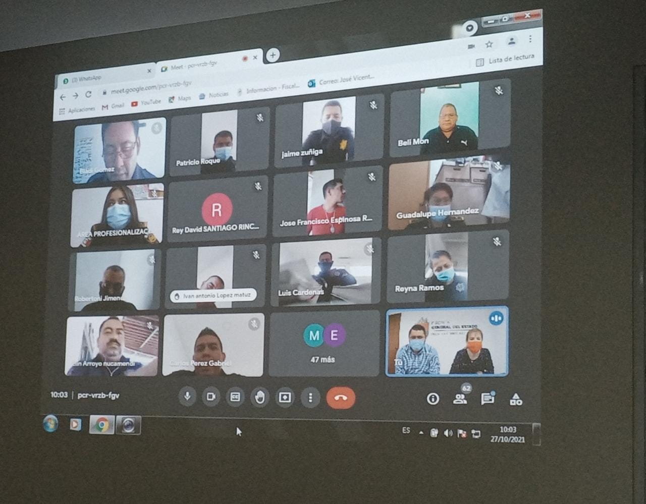 La Fiscalía General del Estado (FGE), a través de la Fiscalía Antitortura, capacitó a 80 servidores públicos de la Secretaría de Seguridad y Protección Ciudadana (SSyPC) mediante la plática de sensibilización denominada Tortura y sus consecuencias jurídicas y Derechos Humanos, impartida virtualmente en coordinación con la Fiscalía de Derechos Humanos.