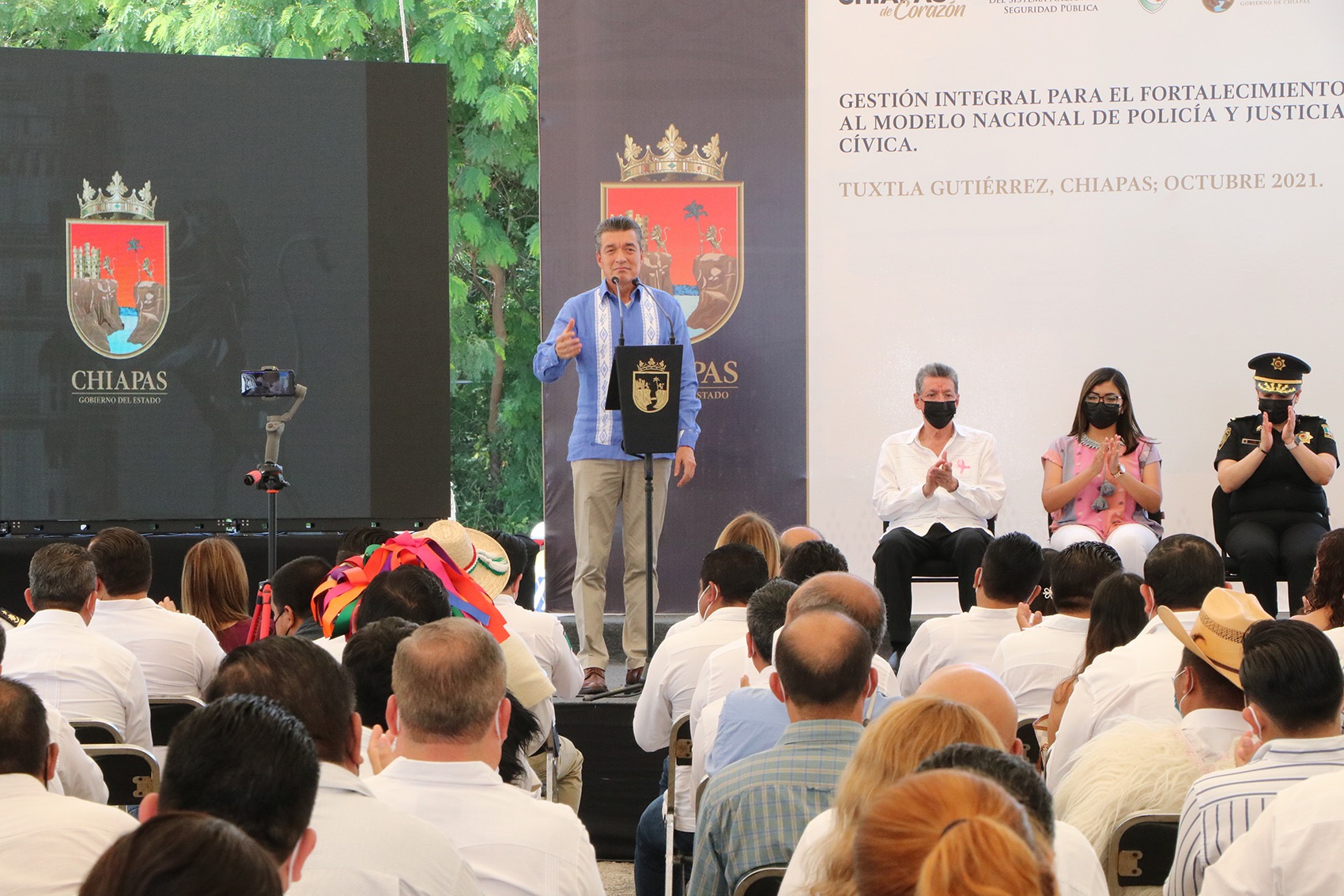 En este marco, el mandatario reconoció el respaldo de la Federación para mejorar las acciones en el rubro de seguridad y mencionó que trabajar en unidad y con honestidad trae grandes resultados, por ello Chiapas mantiene la suma de esfuerzos entre los tres órdenes de gobierno, para continuar como uno de los estados con menos delitos de alto impacto e incidencia delictiva, y lograr la certificación del 100 por ciento de elementos policiales.