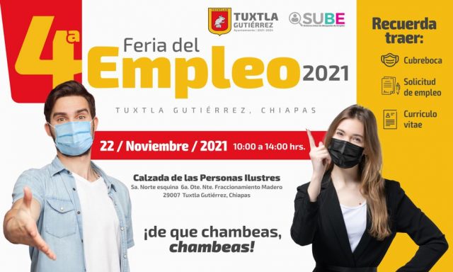 Con la finalidad de fomentar el empleo y la reactivación económica del Tuxtla Gutiérrez, la Secretaría de Economía Municipal a través de la Dirección de Fomento Económico, realizará la Cuarta Feria del Empleo desde la Calzada de las Personas Ilustres, en donde se ofertarán más de 700 vacantes.