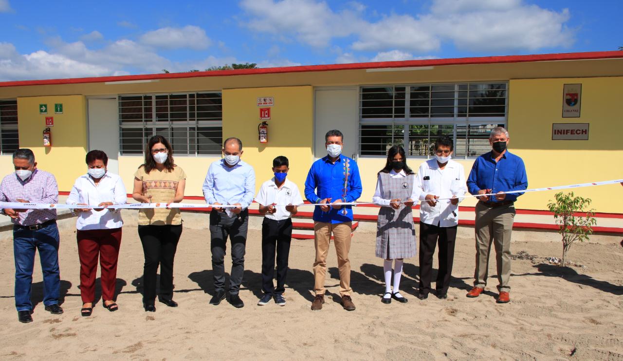 A su vez, el director general del Instituto de Infraestructura Educativa del Estado de Chiapas (Inifech), Enoc Gordillo Argüello, detalló que con una inversión de 4.5 millones de pesos se construyeron tres aulas didácticas y un aula de computación, más la rehabilitación de módulos sanitarios y otros espacios.