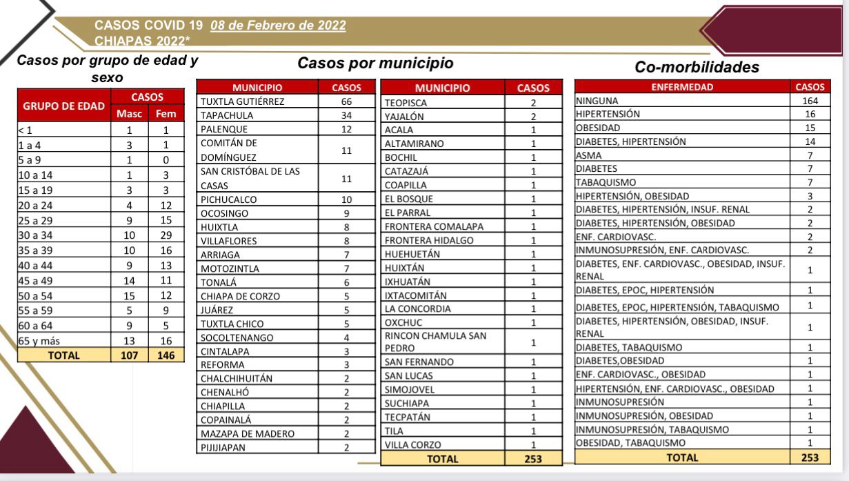 El informe diario sobre el comportamiento de la pandemia por COVID-19 en Chiapas señala que en las últimas horas se notificaron 253 casos nuevos en 49 municipios, comunica la Secretaría de Salud del estado.