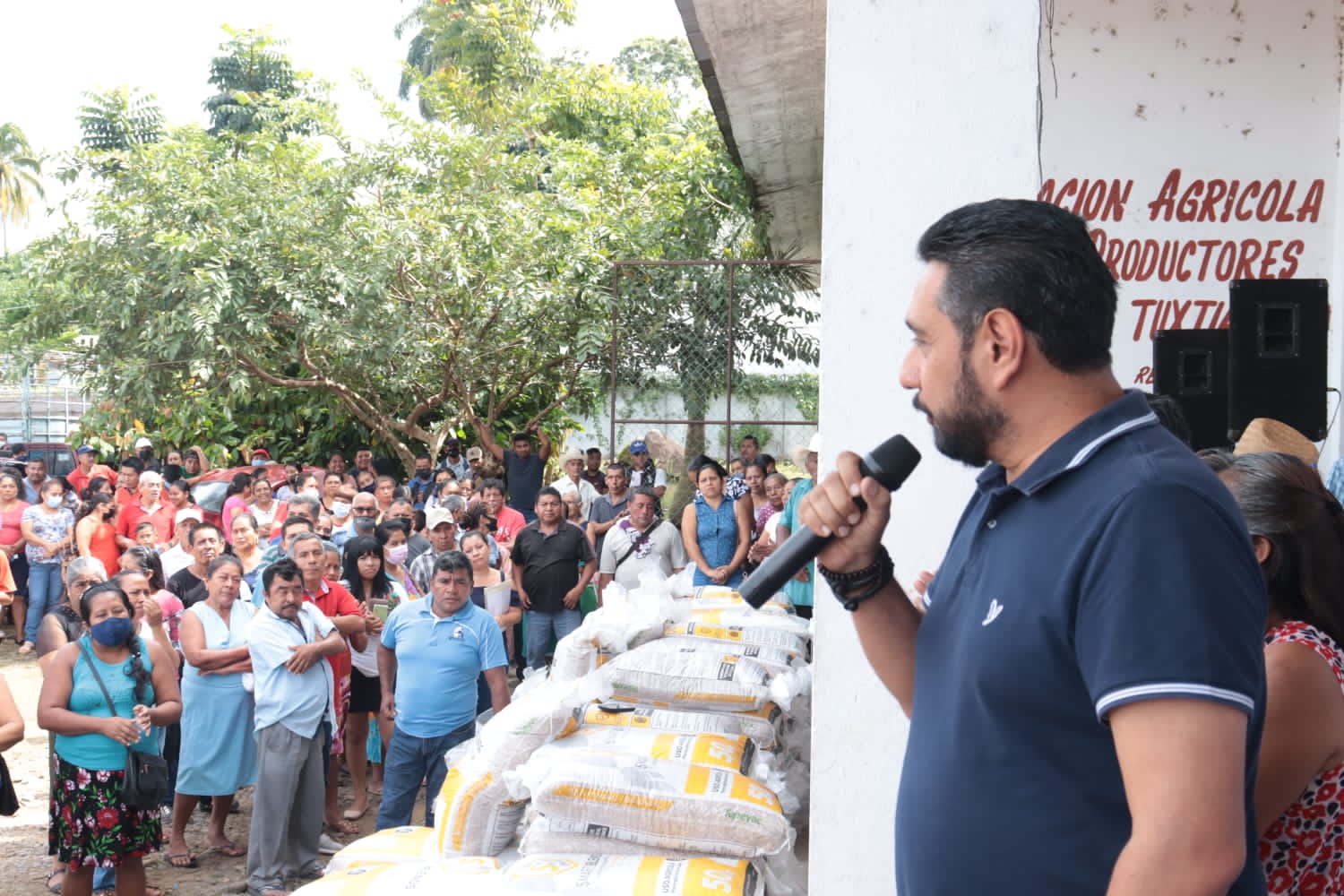 Tuxtla Chico, Chiapas. – Para fortalecer la producción de uno de los cultivos más representativos de Tuxtla Chico, el presidente Municipal Julio Enrique Gamboa Altúzar realizó la entrega de apoyos en fertilizante (fórmula 17-17-17) a productores de cacao.