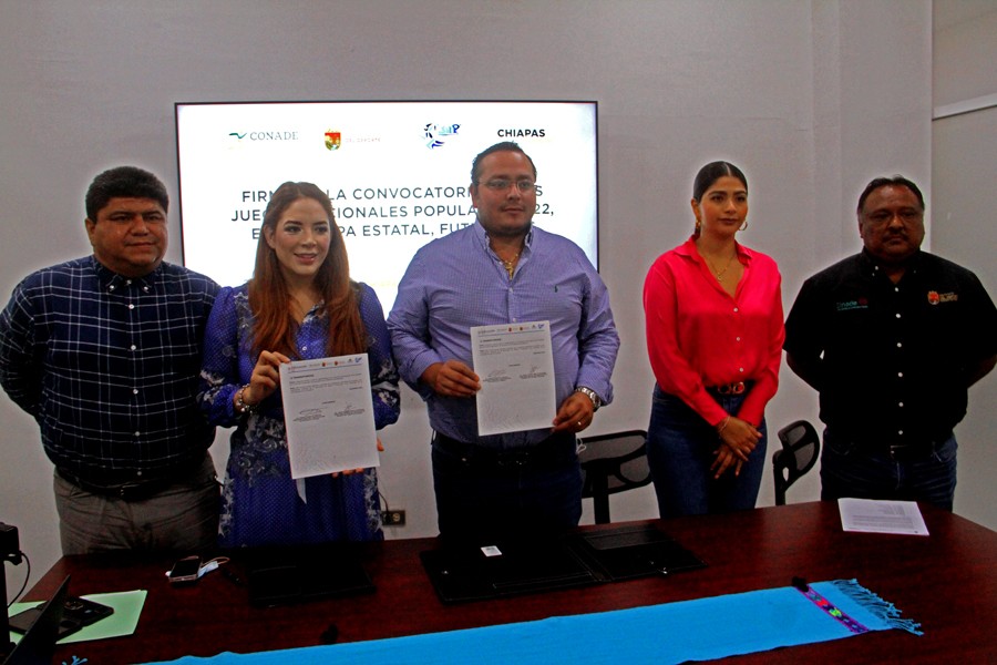 La directora general del Instituto del Deporte, Tania Robles Velázquez y el presidente municipal de Pichucalco, Andrés Carballo Córdova, firmaron la convocatoria de los Juegos Nacionales Populares 2022, en su Etapa Estatal en la disciplina de Futbol 6×6 (ambas ramas), que se realizará en dicho municipio del 16 al 18 de septiembre.