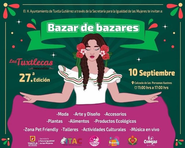 Con motivo al mes patrio, el Mercadito las Tuxtlecas, una iniciativa impulsada desde la Secretaría para la Igualdad de las Mujeres de Tuxtla, llevará a cabo su Vigesimoséptima Edición denominada “Bazar de bazares” este 10 de septiembre a partir de las 11 de la mañana hasta las 5 de la tarde en la Calzada de las Personas Ilustres.