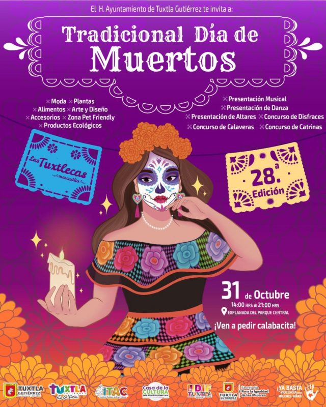 Con motivo a las festividades del tradicional Día de Muertos, la Secretaría para la Igualdad de las Mujeres, el Instituto Tuxtleco de Arte y Cultura, la Sexta Regiduría, DIF Tuxtla y la Secretaría General, invitan este 31 de octubre de 14 a 21 hrs, a la 28ª Edición del Mercadito las Tuxtlecas, la cual se realizará en la explanada del Parque Central.