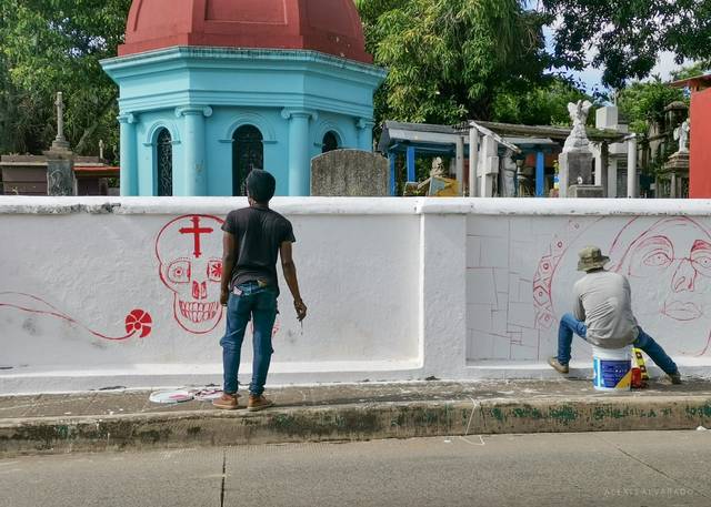 Tapachula, Chiapas; Migrantes inscritos en el programa Emergencia Social del Gobierno Federal, realizan murales alusivos a la tradición mexicana del Día de Muertos, con lo que le dan un toque colorido a los panteones de Tapachula.