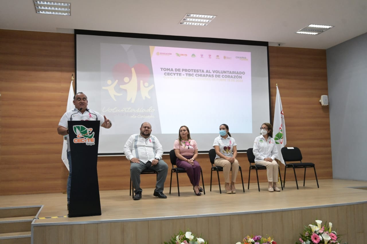 La coordinadora del Voluntariado de Corazón del Sistema DIF Chiapas, Adriana Margarita López Sánchez, acompañada por el titular y coordinador del Colegio de Estudios Científicos y Tecnológicos y Telebachillerato Comunitario de Chiapas (CECyTE-TBC Chiapas), Sandro Hernández Piñón, encabezaron la toma de protesta del Voluntariado del CECyTE-TBC Chiapas de Corazón.