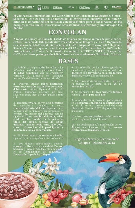 En el marco del 2do. Festival Internacional del Café “Chiapas de Corazón 2022”, regionesSierra – Soconusco, el Gobierno de Chiapas y el Ayuntamiento de Tapachula convocan a las niñas y los niños de 6 al 12 años a participar en el 2do. Concurso de Dibujo Infantil “Creciendo con los Bosques y el Café” para fomentar las expresiones creativas de la niñez y difundir la importancia del cultivo de café. Aquí te compartimos las bases ¡Participa!