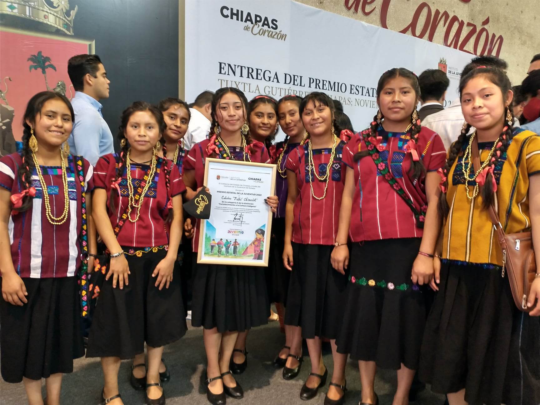Alumnas del grupo de danza “T’ujbil Ch’enetik”, del Colegio de Estudios Científicos y Tecnológicos del Estado de Chiapas (CECyTE Chiapas), Plantel número 38 de la localidad de Mesbiljá, del municipio de Oxchuc, obtuvieron el Premio Estatal de la Juventud 2022, en la categoría A, distinción: Fortalecimiento a la Cultura Indígena.
