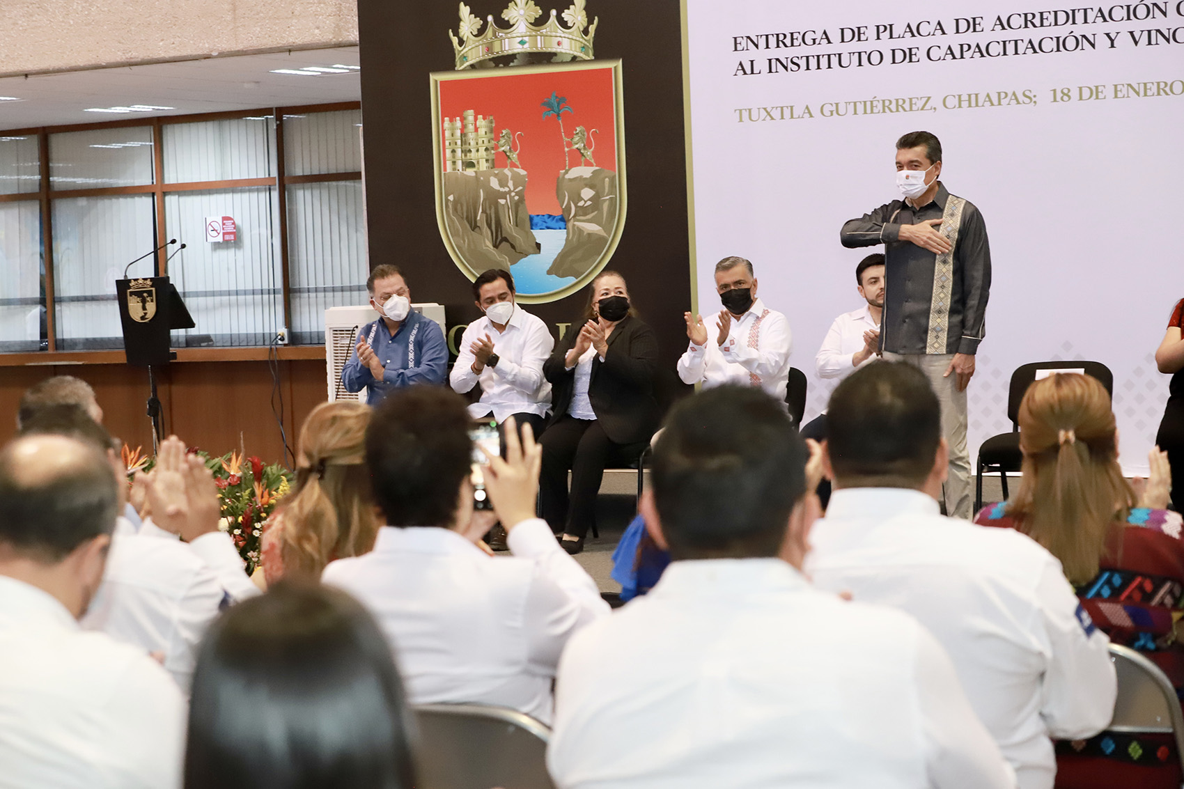 En la entrega de la placa que acredita al Instituto de Capacitación y Vinculación Tecnológica (Icatech) como entidad Certificadora y Evaluadora de Competencias Laborales ante la Red Conocer, el gobernador Rutilio Escandón Cadenas sostuvo que es satisfactorio constatar que en Chiapas hay instituciones fuertes y con alta responsabilidad social, que contribuyen al bienestar de las personas y los sectores productivos, mediante la capacitación y profesionalización laboral.