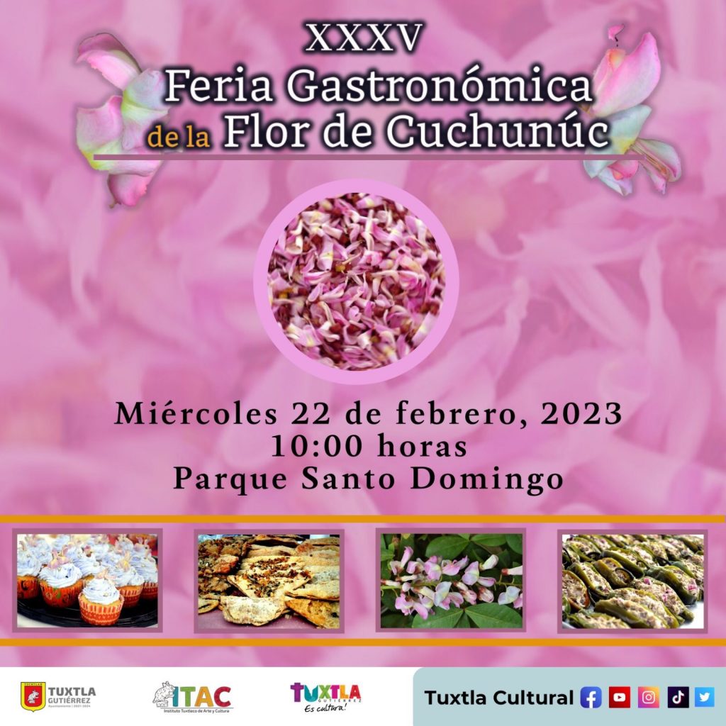 El Ayuntamiento de Tuxtla Gutiérrez, a través del Instituto Tuxtleco de Arte y Cultura, invita a la XXXV Feria Gastronómica de la Flor de Cuchunuc 2023, que se llevará a cabo en el Parque Santo Domingo el miércoles 22 de febrero de 10:00 a 15:00 horas.