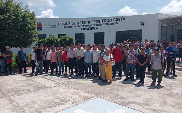 Mazatán, Chiapas. Líderes de la Central Independiente de Obreros Agrícolas y Campesinos, José Dolores López Domínguez (CIOAC-JDLD) y autoridades ejidales de Marte R. Gómez de Mazatán se manifestaron frente a las instalaciones de la Fiscalía de Distrito en Tapachula para pedir la atención ante amenazas del alcalde, Pedro de la Cruz Villalobos en contra de Eduardo Méndez Vázquez, dirigente regional y presidente del consejo de vigilancia en el ejido.