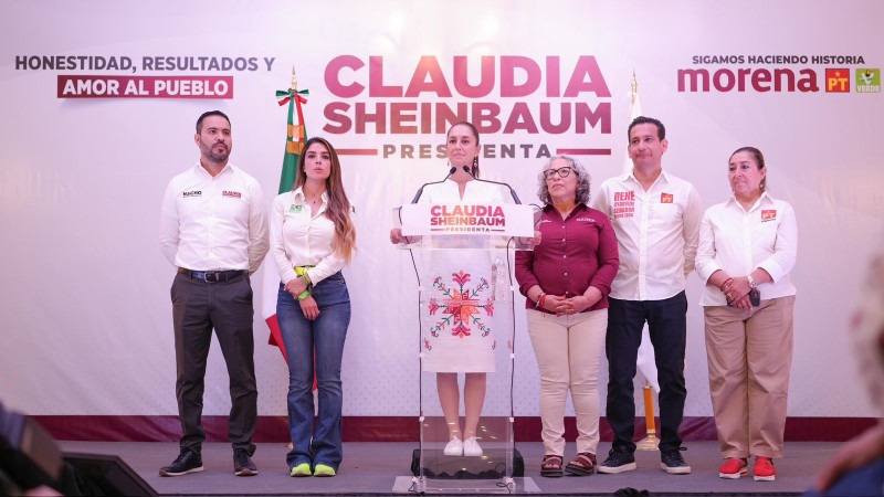 En conferencia de prensa, Claudia Sheinbaum estuvo acompañada de Rita Ozalia Rodríguez, candidata al Senado de la República de Morena; Ignacio Segura Morquecho, candidato al Senado de la República de Morena; René Oyarvide Ibarra, candidato al Senado de la República del Partido del Trabajo y María Teresa Mendoza, candidata al Senado de la República del Partido del Trabajo.
