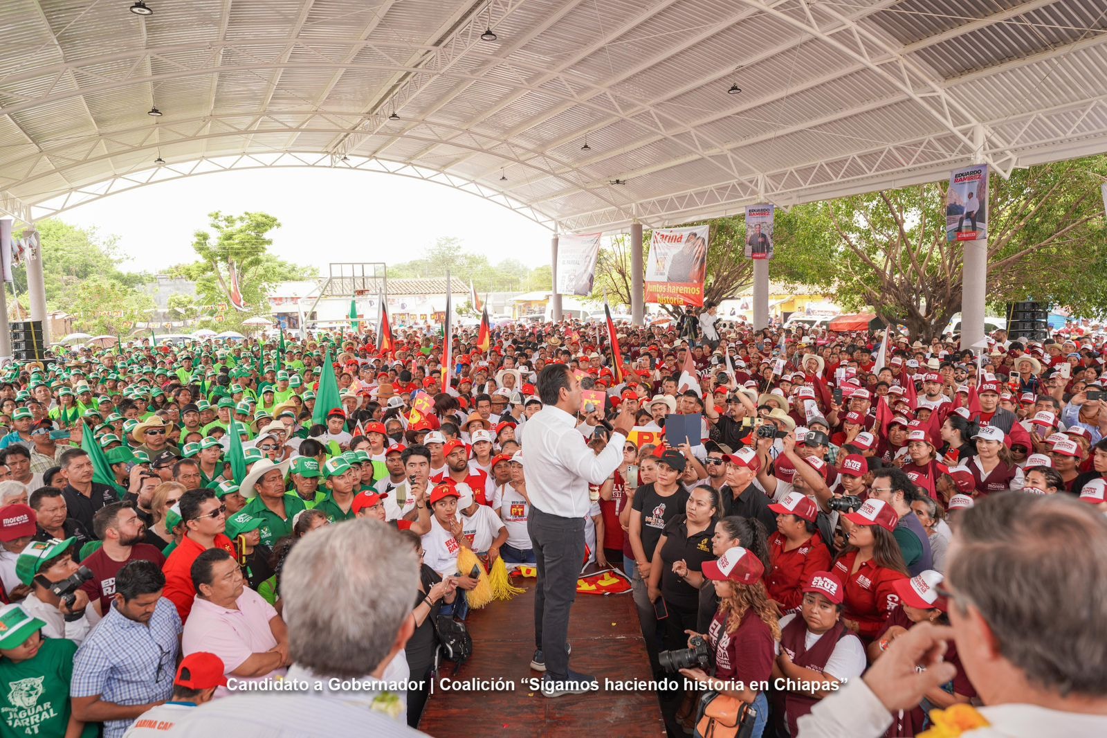 En este recorrido acompañaron a Eduardo Ramírez: Pío López Obrador, hermano del presidente de México, Andrés Manuel López Obrador; el delegado político de Claudia Sheinbaum, Antonio Santos; la secretaria general del Comité Ejecutivo Estatal del PVEM, Valeria Santiago Barrientos; el coordinador estatal del PT, Abundio Peregrino García; el presidente del PES Chiapas, Kalyanamaya De León Villard; el presidente del Comité Ejecutivo Estatal del PPCH, Mauricio Morales Valdez;