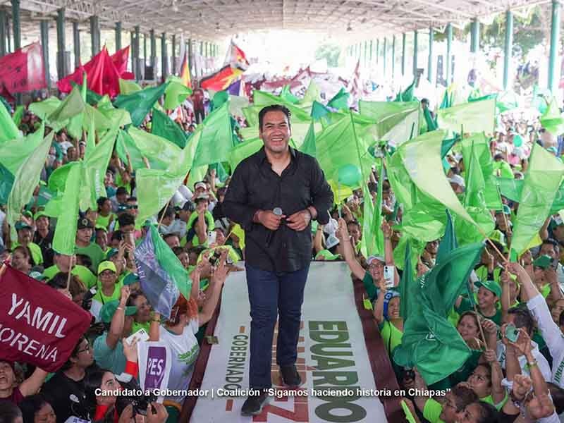 En medio de una fiesta en la que resonaban las letras “Y repican las maderas, se escucha el canto del Quetzal, ya vio venir la nueva era de la Chiapanequidad”, miles de personas acompañaron al candidato a gobernador por la coalición “Sigamos Haciendo Historia en Chiapas”, Eduardo Ramírez Aguilar, en su cierre de campaña electoral en el municipio de Tapachula.