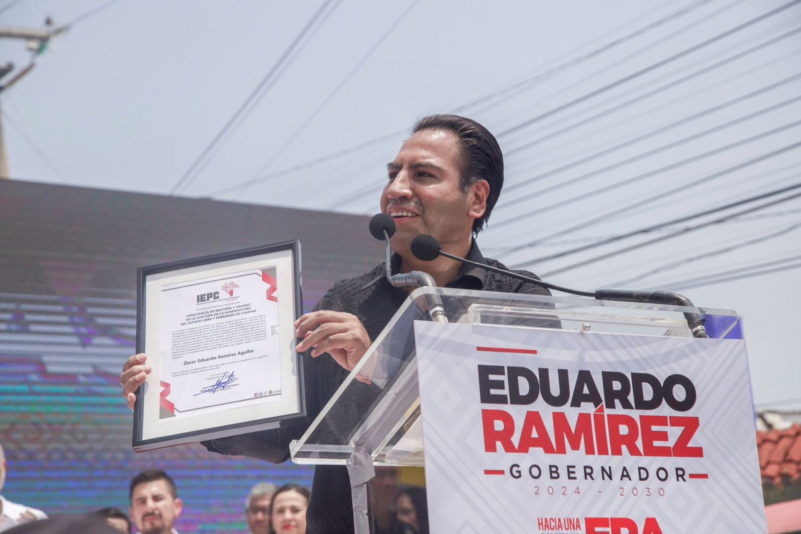 En este marco, Eduardo Ramírez expresó: “Para mí es un honor recibir esta constancia que me acredita como gobernador electo, para mí simboliza el sentimiento del pueblo de Chiapas. Espero estar a la altura de las circunstancias y que Chiapas viva los momentos de progreso de prosperidad que tanto anhela”.