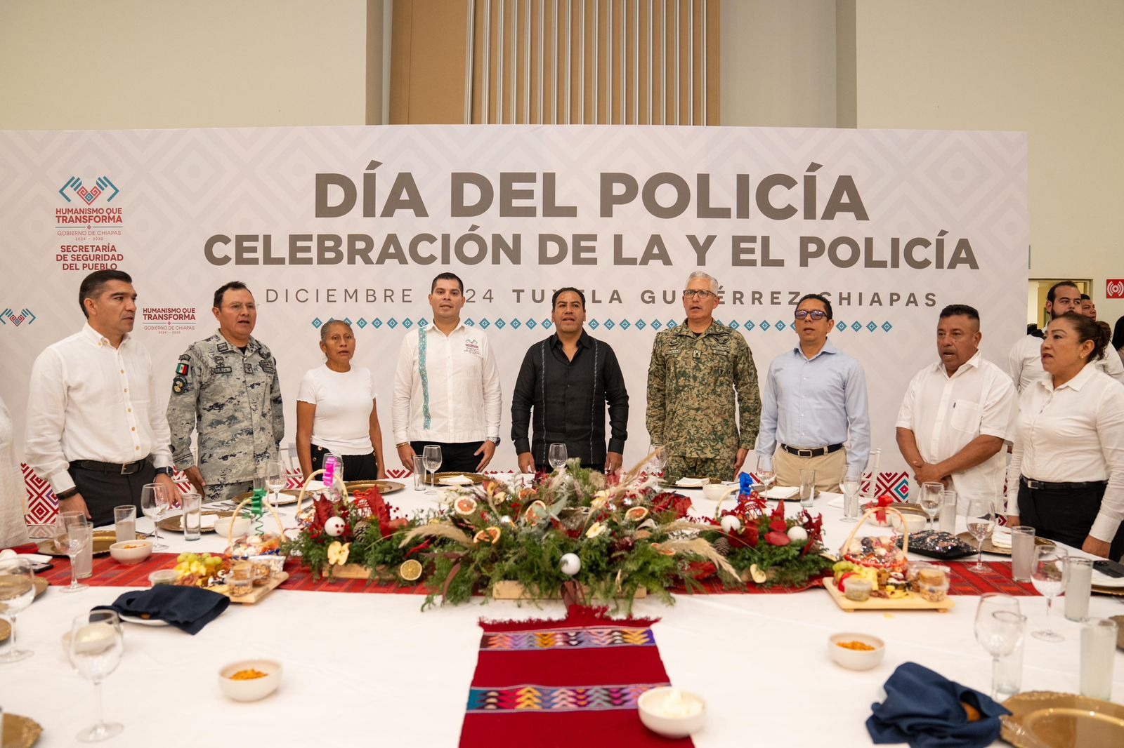 El gobernador Eduardo Ramírez Aguilar encabezó la celebración del Día de la y el Policía, acompañado del comandante de la 31 Zona Militar, el general Román Villalvazo Barrios; del secretario de Seguridad del Pueblo, Óscar Alberto Aparicio Avendaño; y el fiscal general del Estado, Jorge Luis Llaven Abarca, donde anunció que, con el acompañamiento y respaldo de las Fuerzas Armadas, las corporaciones de seguridad del estado y federales ingresarán a los municipios de las regiones Frontera, Sierra y Frailesca para recuperar la paz y aplicar la ley en contra de quienes ataquen las vías de comunicación y quieran someter al pueblo.